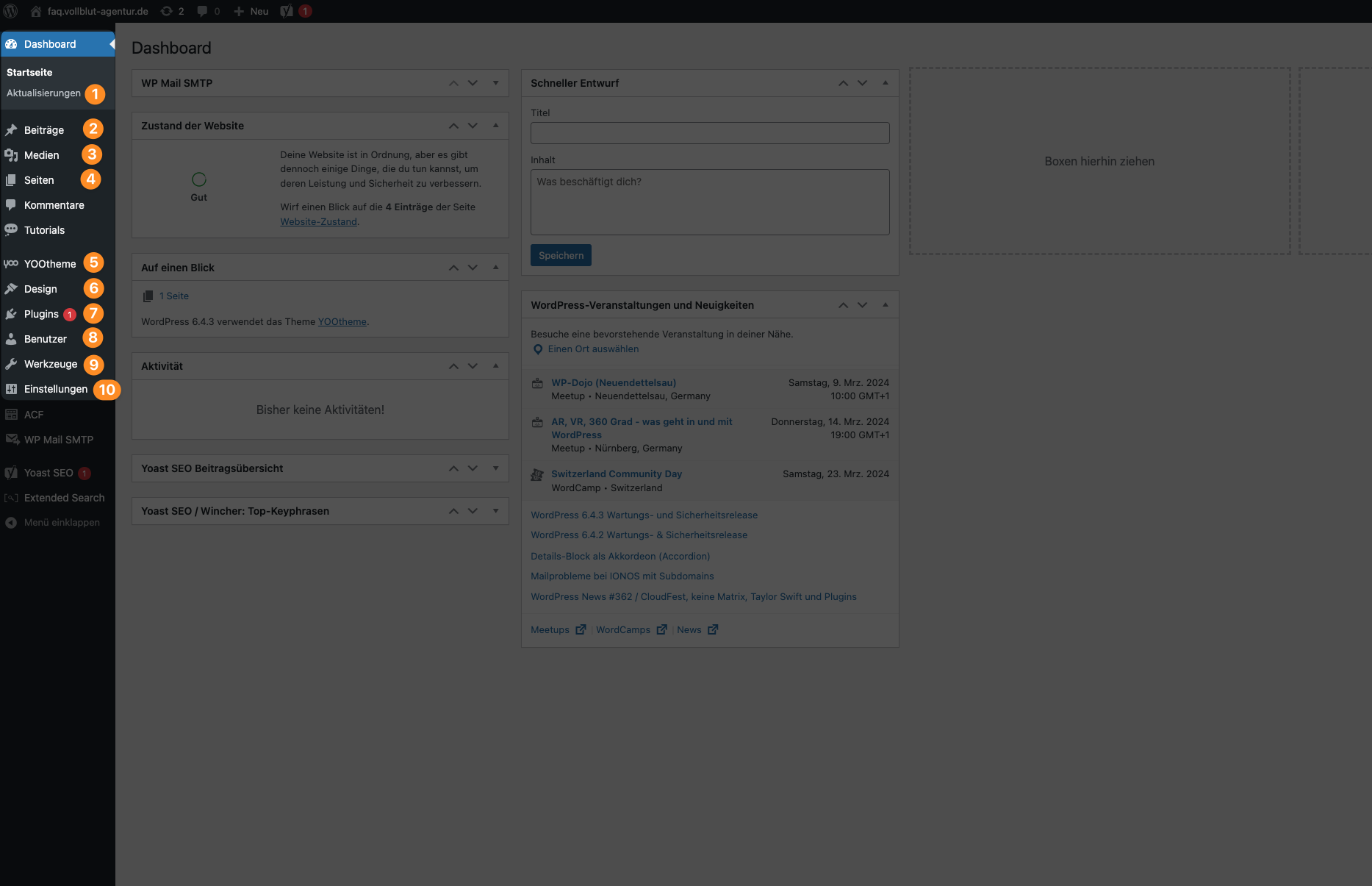 Das Dashboard ist das erste was Sie sehen, wenn Sie sich in das Backend Ihrer Seite eingeloggt haben. Von hier aus veralten Sie Ihre Website.